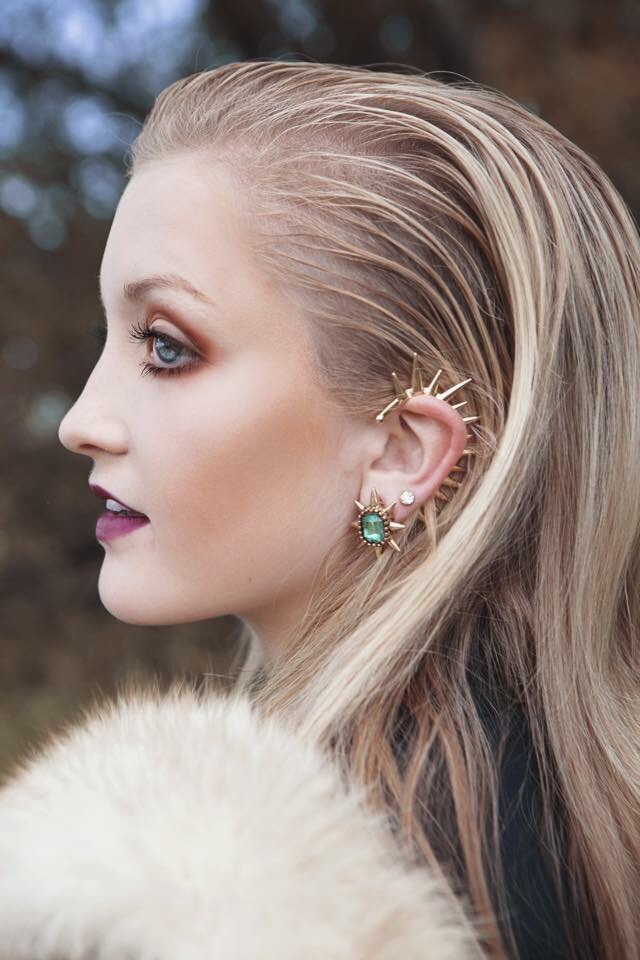 Like I said earlier, I don’t do hair. I barely do my own damn hair. Knowing that we had to change three looks in a day meant that I had to find something I could do and undo very easily. Since she had a whole power glam look going, I thought, what if we slicked her hair back? We needed something off of her face so that we could see the ear cuffs and earrings she was wearing anyway. So I sprayed beach spray into her hair and brushed the sides back. I used beach spray instead of hairspray because I knew that it would brush out a lot easier. Voila! It worked! Well, it could have been a lot worse lol.