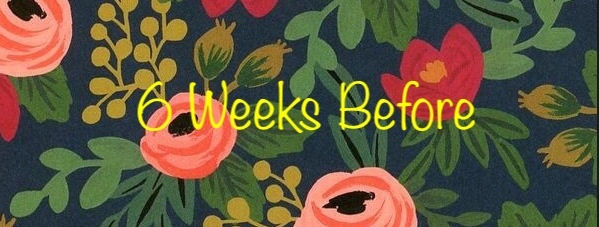 Six weeks before! Make sure that you have all of your papers in order and take your butts down to apply for your wedding license. Besides that, get everything printed that you need to. Place settings, menu cards, ceremony program ect. Everything you need printed should be taken to get done.